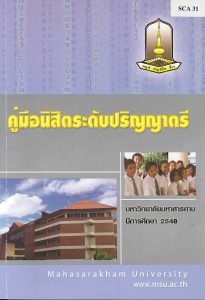 คู่มือนิสิตระดับปริญญาตรี มหาวิทยาลัยมหาสารคาม ปประจำปีการศึกษา 2548 ได้รวบรวมทำเป็นรูปเล่มโดยกองทะเบียนและประมวลผล เพื่อวัตถุประสงค์ให้นิสิตทุกคนได้ศึกษาค้นคว้าและอ้างอิงระหว่างการศึกษาในมหาวิทยาลัย ประกอบด้วยคู่มือทั่วไปของมหาวิทยาลัย ข้อบังคับ และประกาศมหาวิทยาลัยมหาสารคาม นิสิตใหม่ทุกคนควรศึกษา เพื่อเป็นแนวปฏิบัติในการดำเนินการศึกษา