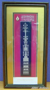 วันที่ 29 ตุลาคม 2547 ชมรมมูนมังอีสานล้านช้างศึกษา มหาวิทยาลัยแม่ฟ้าหลวง มอบของที่ระลึก เป็นกรอบรูปลายไทยล้านช้างสัญลักษณ์ของภาคเหนือ แด่สำนักวิทยบริการ มหาวิทยาลัยมหาสารคาม