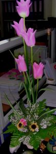 กระถางพร้อมช่อดอกไม้ (ดอกทิวลิปสีชมพู)