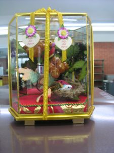 หน่วยงานภายนอก มอบกล่อง 6 เหลี่ยม มีนก 2 ตัว ที่ต้นไม้ ให้แด่สำนักวิทยบริการ มหาวิทยาลัยมหาสารคาม เนื่องในโอกาสมาเยี่ยมชมสำนักวิทยบริการ มหาวิทยาลัยมหาสารคาม